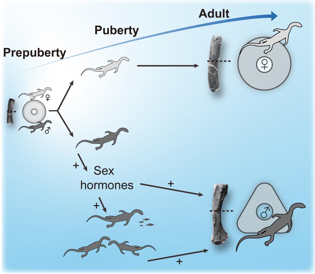 贵州龙(Keichousaurus)是一种发现于中国西南部三叠系(约2.4亿年前)沉积物中的小型海生爬行动物,化石数量众多,发育明显的两性异形。不同性别的贵州龙个体在发育过程中前肢骨骼的生长存在显著变化(见图1)。脊椎动物长骨能保存类似于树轮的生长年轮。研究团队通过对贵州龙前肢骨骼(属于长骨)大量的骨组织学取样,首次识别出化石脊椎动物的性发育过程。通过对多件贵州龙标本的骨密度和生长模拟,确定了贵州龙的性发育的开始与终止阶段(青春期)在其生命周期的第二年完成(见图1)。此外,通过对胚胎/幼年个体、青春期个体以及成年个体骨组织的对比研究,研究团队论证了内源的性激素调控以及外部的荷载压力刺激(雄性个体在青春期更高的捕食和竞争需求)对贵州龙青春期前肢骨骼发育的影响(图2)。