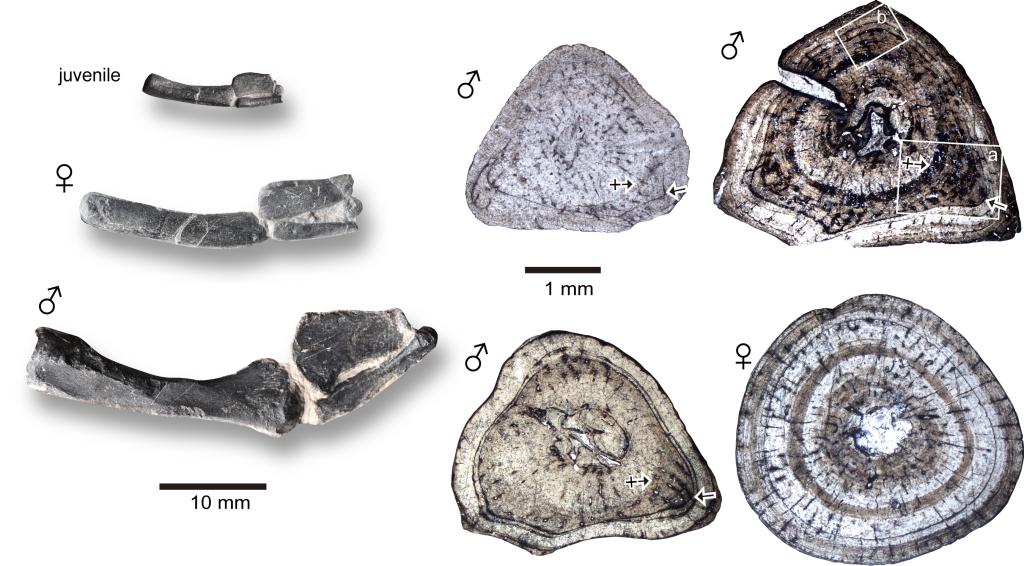 同一物种中不同性别间的显著身体差异被称为“两性异形”或者是“第二性征”,例如鹿角、孔雀羽毛以及雄狮的鬃毛。这些差异通常在个体成年后才出现,为我们理解动物的生长和繁殖提供了重要的信息。在现生动物中,两性异形通常在青春期伊始时开始发育,其形成代表了性发育的完成。同样,对于灭绝生物来说,通过分析化石保存下来的两性异形特征,我们可以了解已灭绝动物个体发育的差异,并以此推断这些差异与生态、生活习性和社会行为的关联。另一方面,对于一些化石物种来说,雌性和雄性可能在形态上有所区别,了解性二态的特征和性发育的过程有助于化石种属的界定。