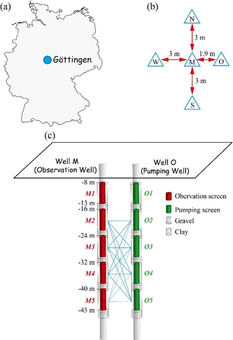 图2(a)哥廷根大学试验场地地点(b)试验场地井布设情况(c)水力层析试验、热示踪试验中井的设置情况