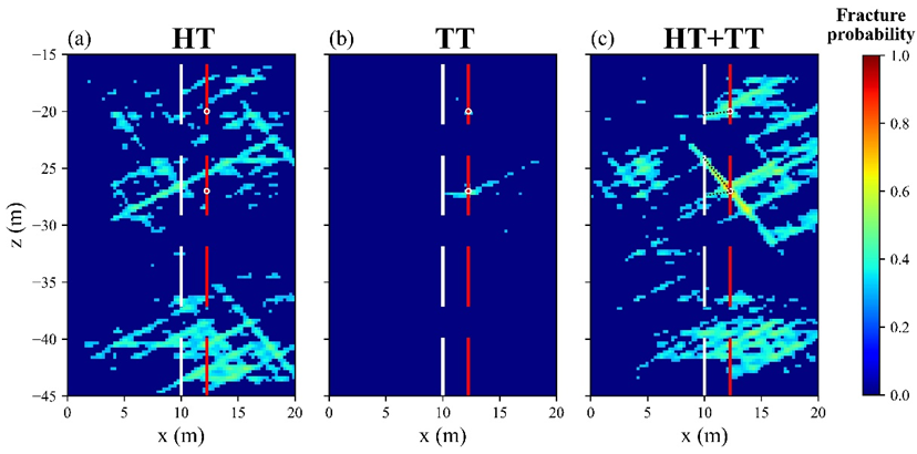 针对上述科学问题,本研究采用基于深度学习方法的联合反演框架(Convolutional variational autoencoder – ensemble smoother with multiple data assimilation, CVAE-ESMDA),融合水力层析及热示踪层析数据,实现了在较少观测点情况下对裂隙介质的精细刻画。另外,为体现框架在实际工程中的有效性,还对德国哥廷根大学北校区一处裂隙含水层场地进行了精细刻画。