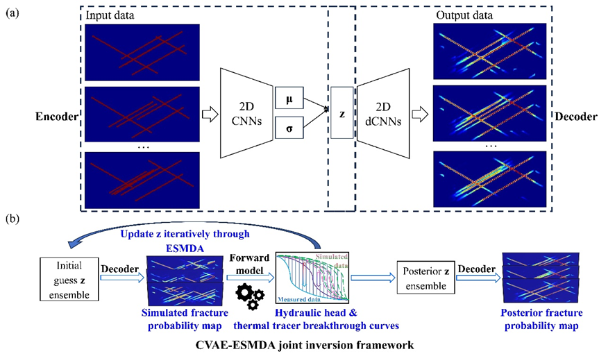 研究论文得到以下主要认识,一是深度学习方法能够使用低维、高斯分布的潜变量来表征高维、非高斯分布的裂隙介质参数场,克服了传统反演方法的缺陷且为后续的精细刻画打下了基础;二是通过多源数据之间的协同效应能够实现在较少观测井下的裂隙介质精细刻画。