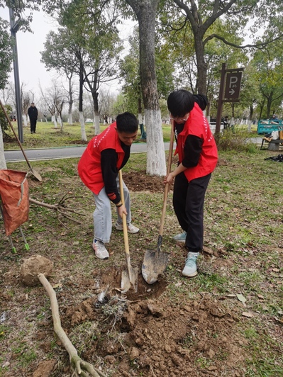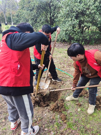 活动现场,同学们分工协作、干劲十足,大家一起挥锹铲土、搬运树苗,扶正苗木、倒水浇树,展现出了一片热火朝天的劳动景象。在默契配合下,不一会儿,一排排新植的树苗昂然挺立在山头,在和煦的微风中萌发盎然生机,为蜀山森林公园又添一抹绿意与活力。