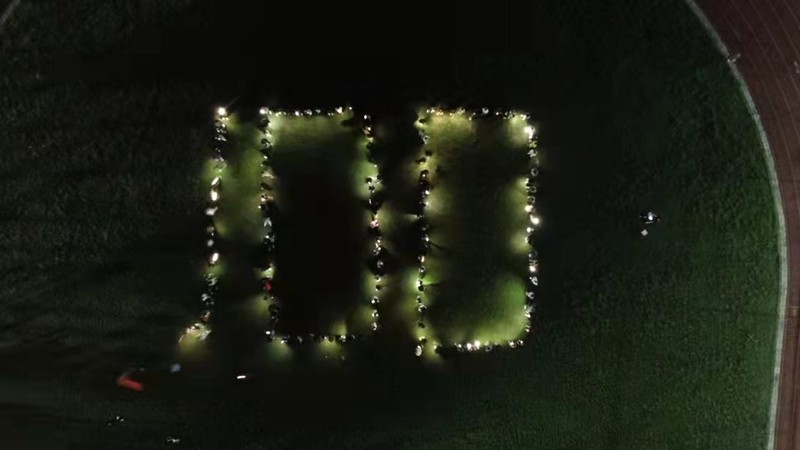 晚上七点,72组同学齐聚操场,在活动横幅上签名,并领取专属荧光棒进行合影留念。一场与青春同行的荧光盛宴就此拉开帷幕。同学们手持荧光棒,在工作人员的引导下,摆出100的字样,醒目地彰显出工大学子对党的热爱与祝福,展现了青年学生的创意与风采。