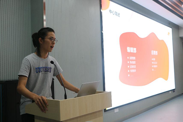 最后,以辩论队、阳春社志愿者协会、新媒体协会、科创中心、心理健康协会的顺序,社团和四个中心依次上台为新生介绍各自的职能。宣讲人除了运用PPT介绍,还很用心的通过视频展示了中心文化和特色活动,精彩的视频配合详细的讲解引起了在场同学们的热烈反响。