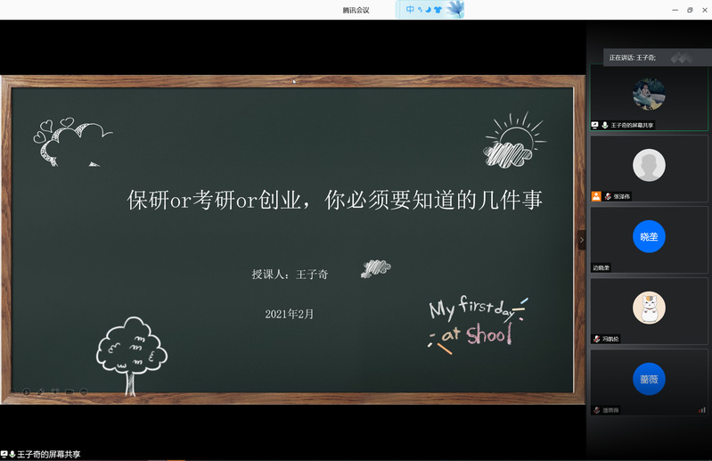 会议的开始,王子奇老师介绍了奖学金评选的流程,例如奖学金评选排名的计算方法,特别阐释“单项奖学金”相关问题,为同学们详细讲述了大学期间获得奖学金的重要性。之后又向同学们介绍了保研有关必要条件,尤其鼓励同学们积极参加创新创业竞赛活动,详细地告知同学们保研流程和时间节点。最后着重向同学们介绍了考研和工作的利弊,保研和考研的区别,鼓励同学们考研途中要持之以恒、锲而不舍。同学们积极投入到对奖学金、保研、考研等问题的讨论和思考当中。