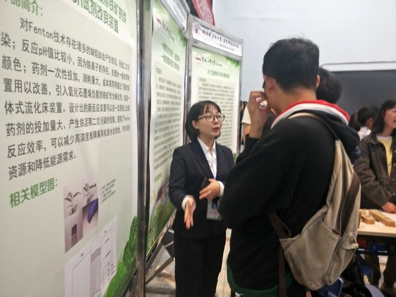 出席仪式的领导和嘉宾一起参观了第五届大学生创新创业作品博览会。在这次博览会中,我系展示了近年来参加比赛获奖的优秀作品共五份。 “一种集余热发电、油烟净化一体的循环碳汇厨房系统”是一套充分利用能源,改善二氧化碳导致的环境污染问题及能源浪费问题,并具有便于清洁优点的厨房系统;“厨房污水净化再利用处理装置”是一套能够净化生活污水、方便安装和清洗更换,并且价格低廉、容易清洗的生活污水处理器;“new氧化石墨烯负载赤铁矿的类Fenton试剂改良装置”起到了改善Fenton技术的作用,实现了减少高浓度难降解有机废水的排放,节约了药剂资源,降低了能源需求;“人工湿地污水处理系统”利用PRB可渗透反映墙对水体进行预处理,之后再在包括了污水容纳池、沉水植物苦草和浮水植物浮萍、石料和铁屑等的污水处理系统中再一步处理;“基于压电效应的机场灯自供电装置”利用飞机滑行时对地面产生的振动机械能,并通过一系列整流装置发电从而实现器件或设备的自供能,这不但产出电能,还可以减少路面的振动与变形,减少路面结构损伤,降低结构维护成本以及减少噪音等。