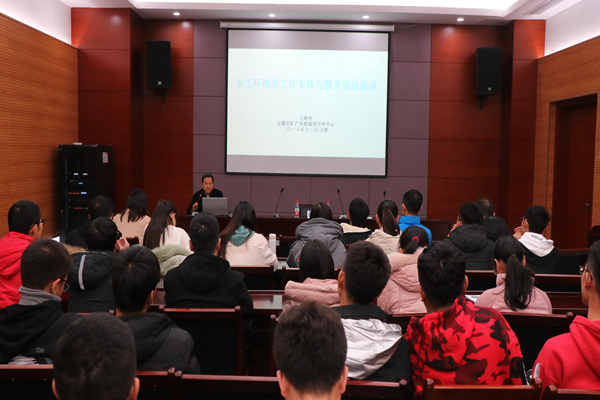 王晓明教授从传统文化入手,以说文解字的方式对水文地质学展开介绍,而后详细解读了水文地质学的服务方向,包含基础地质研究、资源勘查与开采、环境保护、城市规划、污染治理等。王教授进一步介绍水工环专业的学生可能的就业方向包括研究院、事业单位、企业等。水工环专业学生能够通过参与国家重大工程如“引江济淮工程”,投身国家生态环境的恢复和重建,地下水污染治理等,以实际工作为祖国发展贡献力量。