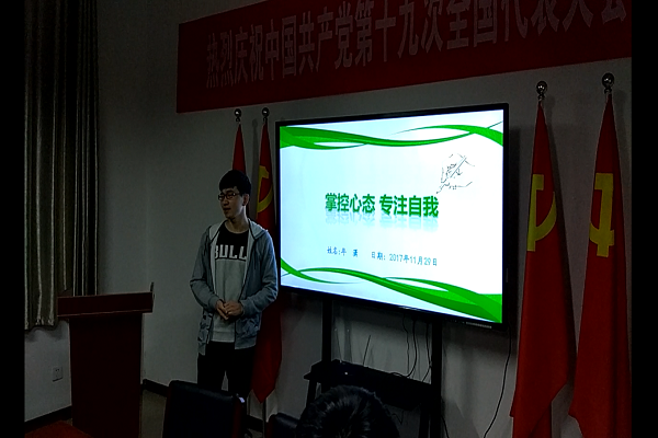 年潇同学演讲的题目是《心态》,他首先从多种类型的心态入手,对比了积极与消极两类心态的特征和影响,使得在座同学们对于心态问题有了更进一步的理解。接着,他列举了一些包含不同心态的小故事,结合心态理论更形象地阐述了积极心态给人带来的积极影响。最后,发展对象洪晓梅同学结合当下社会中人们对于热点时事的态度发表了自己的看法。