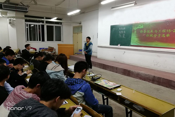 举行2017-2018学年第一学期入党积极分子选举,通过个人参与演讲和与会人员投票方式,最终选举出姚玉川、胡华能两名优秀入党积极分子。