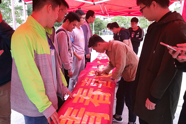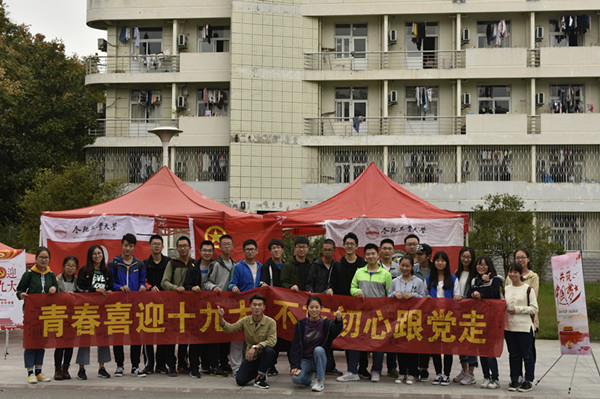 “党的十九大”专题宣传活动分为线下和线上两部分。10月18日中午,资环学院与电物学院联合举办“青春喜迎十九大,不忘初心跟党走”横幅签名活动,过往师生纷纷在条幅上签名、留言,表达对活动的支持。短短半小时,横幅上已是满满的喜悦之心,爱国之情。此外,志愿者们利用海报等向过往师生宣传十九大报告的重要论断。