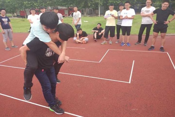 “四人五足”要求四个人并排,相邻两人的腿绑在一起,四人齐心协力通过指定区域。“盲走迷宫”要求两人一组,一人背着另一人走迷宫,背人的同学要蒙住双眼,由背上的人指挥通过迷宫,途中不能踩线也不能放下背上的人。迷宫由班委们合力设计并实施规划。