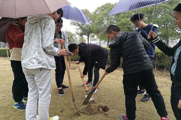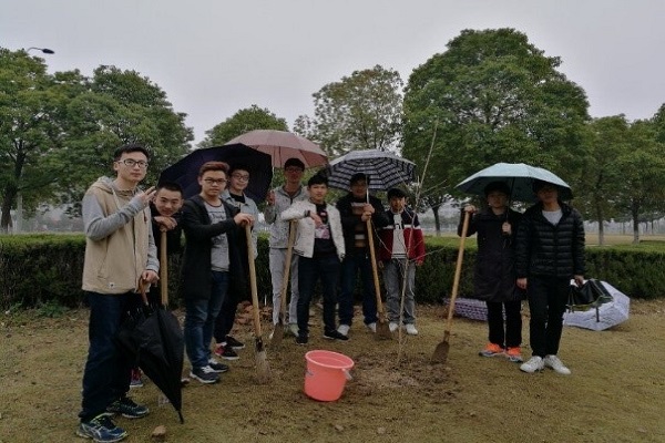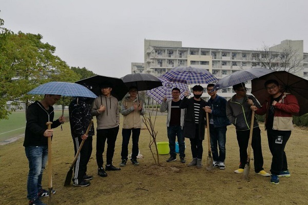 本班同学在植树节之前就做好了细致的准备工作,包括购买树苗、联系种树地点,准备工具以及人员分工等。树苗共有三棵,其中有两棵白果树,一棵紫藤树。12日的下午,在班长的带领下,全体同学都来到了西操场边的空地植树。虽然下着雨,但是同学们充满了干劲,有的挖坑;有的扶树;有的浇水,生怕因为自己的工作不到位影响小树苗的生长。