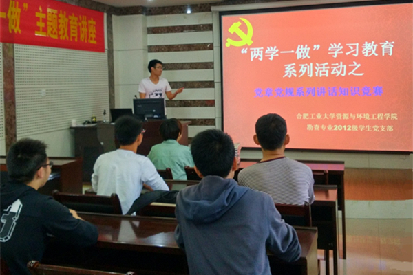 为进一步深入贯彻党中央和学校关于在全体党员中开展“学党章党规、学系列讲话,做合格党员”学习教育的有关精神,将“两学一做”学习教育落实到每一个基层党员,勘查2012级学生党支部于2014年4月23日上午9时在纬地楼四楼报告厅组织开展了党章党规系列讲话知识竞赛活动。