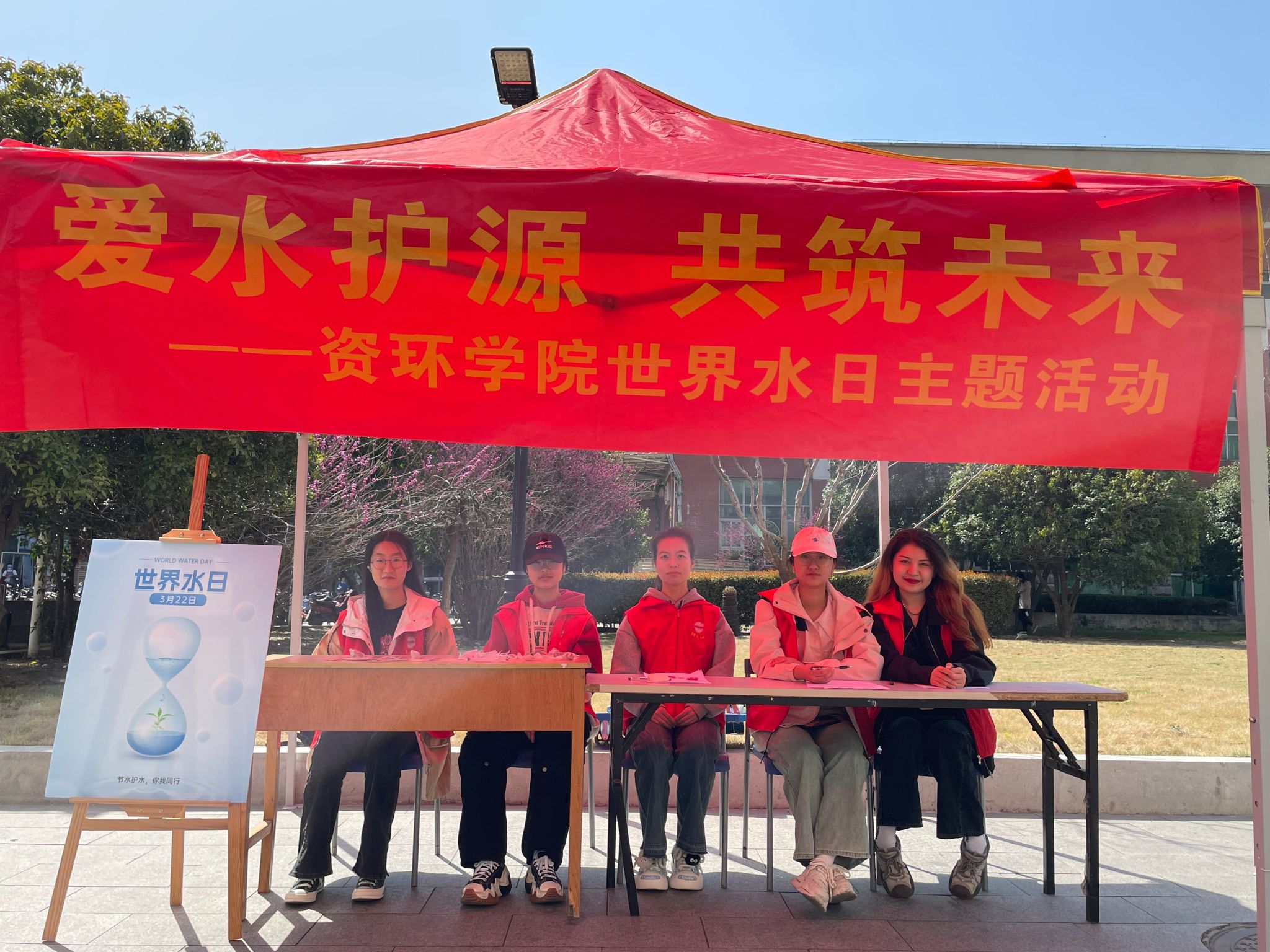 为迎接第32个世界水日,提高师生节水意识,3月22日,taptap点点官方网站阳春社在屯溪路校区德园食堂广场开展“爱水护源,共筑未来”世界水日主题宣传活动。