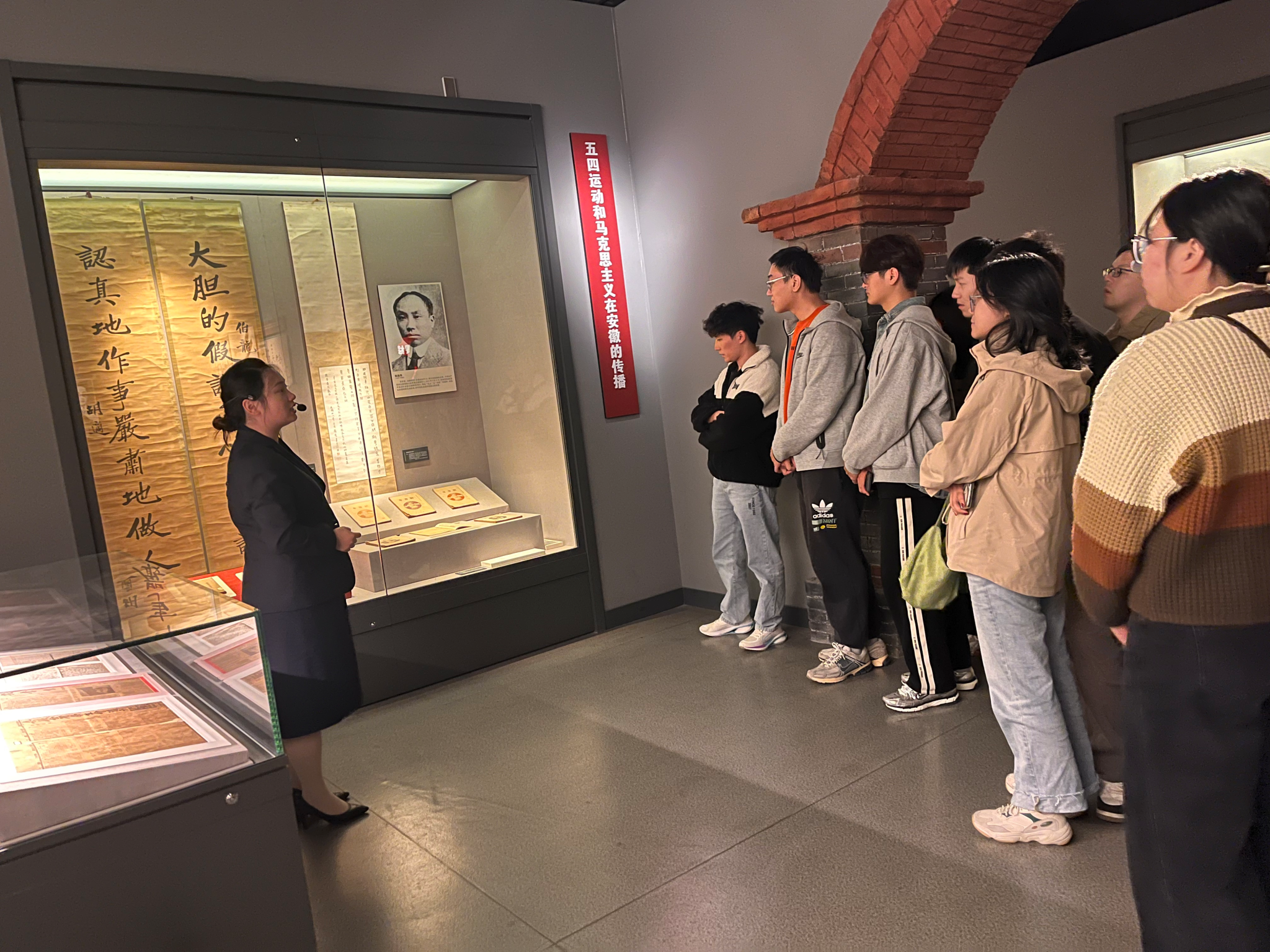 安徽省博物院常设展览“烽火江淮——安徽革命史陈列”,通过一张张图片、一段段文字、一件件实物,全面展现了五四运动后安徽儿女的革命历史,再现了五四运动、安徽地方党组织建立、安徽地区苏维埃政权建立、新四军开辟抗日民主根据地、淮海战役和渡江战役等重大历史事件,同学们在展厅中深刻感受到安徽人民不屈不挠、英勇抗争精神。随后在“山河安澜——淠史杭灌区主题展”展厅内,同学们依次参观“千年夙愿”、“百年伟业”、“精神丰碑”和“时代华章”四个展区,了解到“人间天河淠史杭”的建设历程和发挥的重要作用,重温了革命先辈在极端困难的条件下建设惠及皖豫、横跨江淮的淠史杭水利工程的光辉历史。