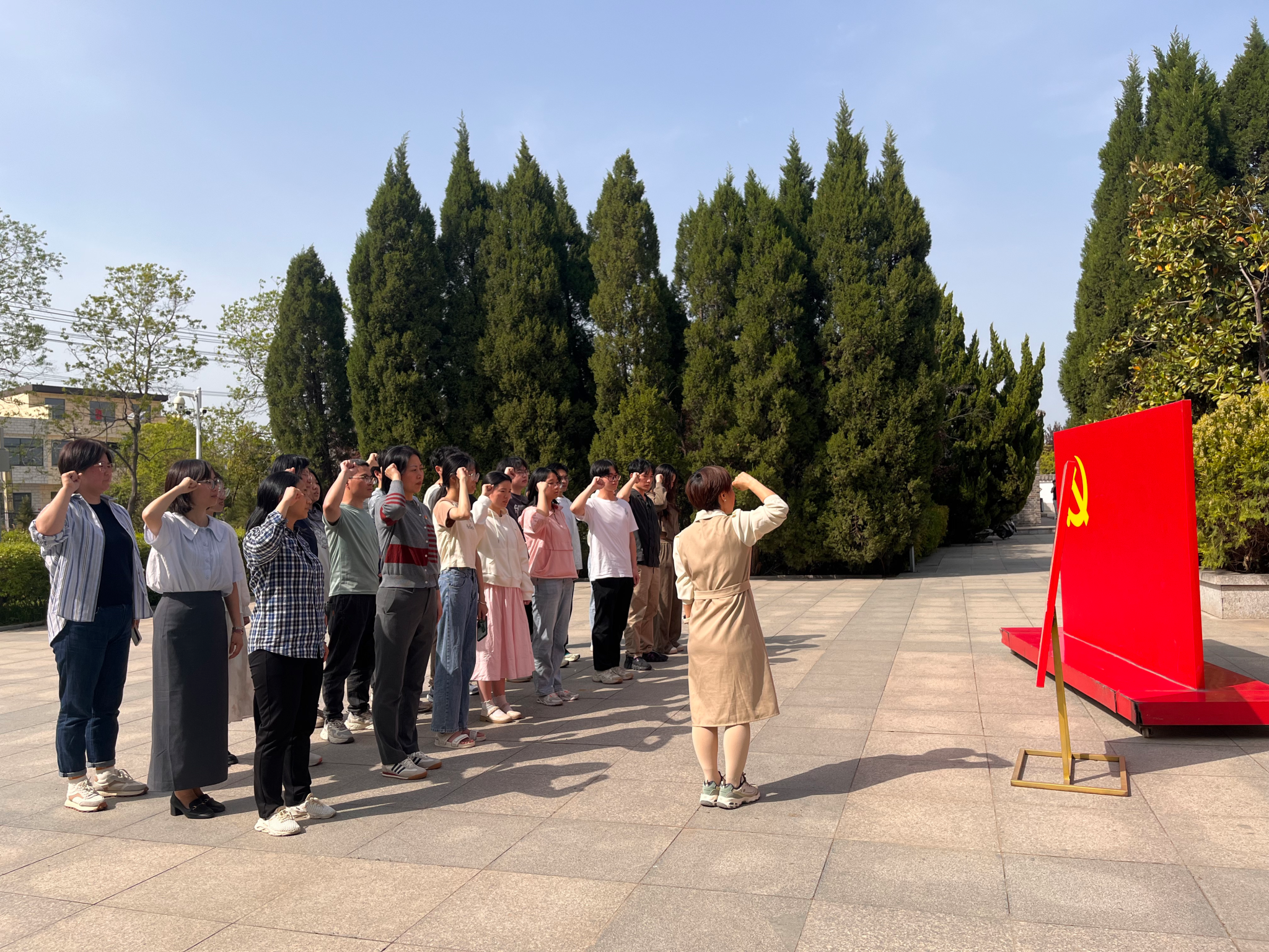 随后,师生走进寿县革命烈士陵园。在革命烈士纪念碑前,全体党员怀着对革命先烈的缅怀之情,面对鲜红的党旗,庄严地举起右拳,一同重温入党誓词,再一次郑重表达自己对党忠诚矢志不渝的坚定信仰。