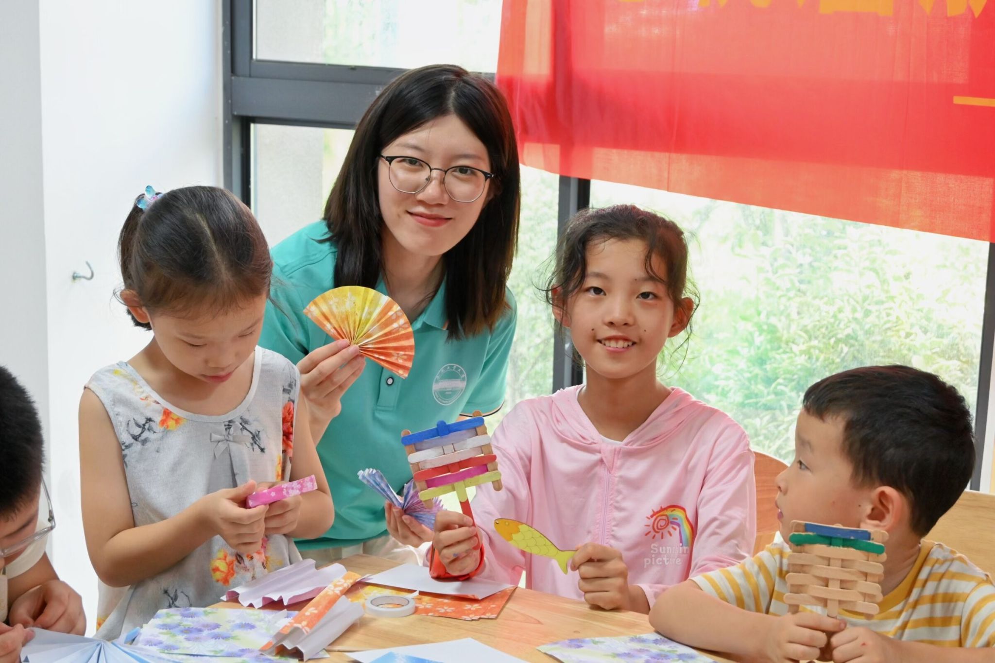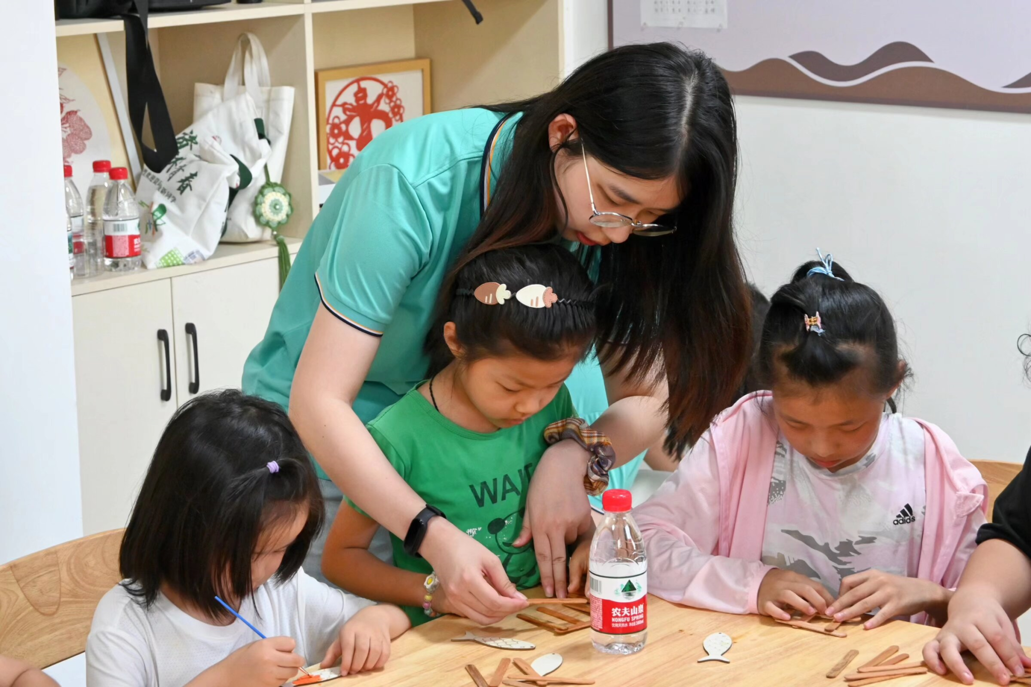 团队开设“环保创意工坊”,通过垃圾分类互动问答、变废为宝手工制作等活动,向社区儿童普及环保知识。队员带领孩子们利用废旧雪糕棒、纸张等材料制作木扇、挂饰,在实践中增强环保意识,让绿色理念扎根心田。