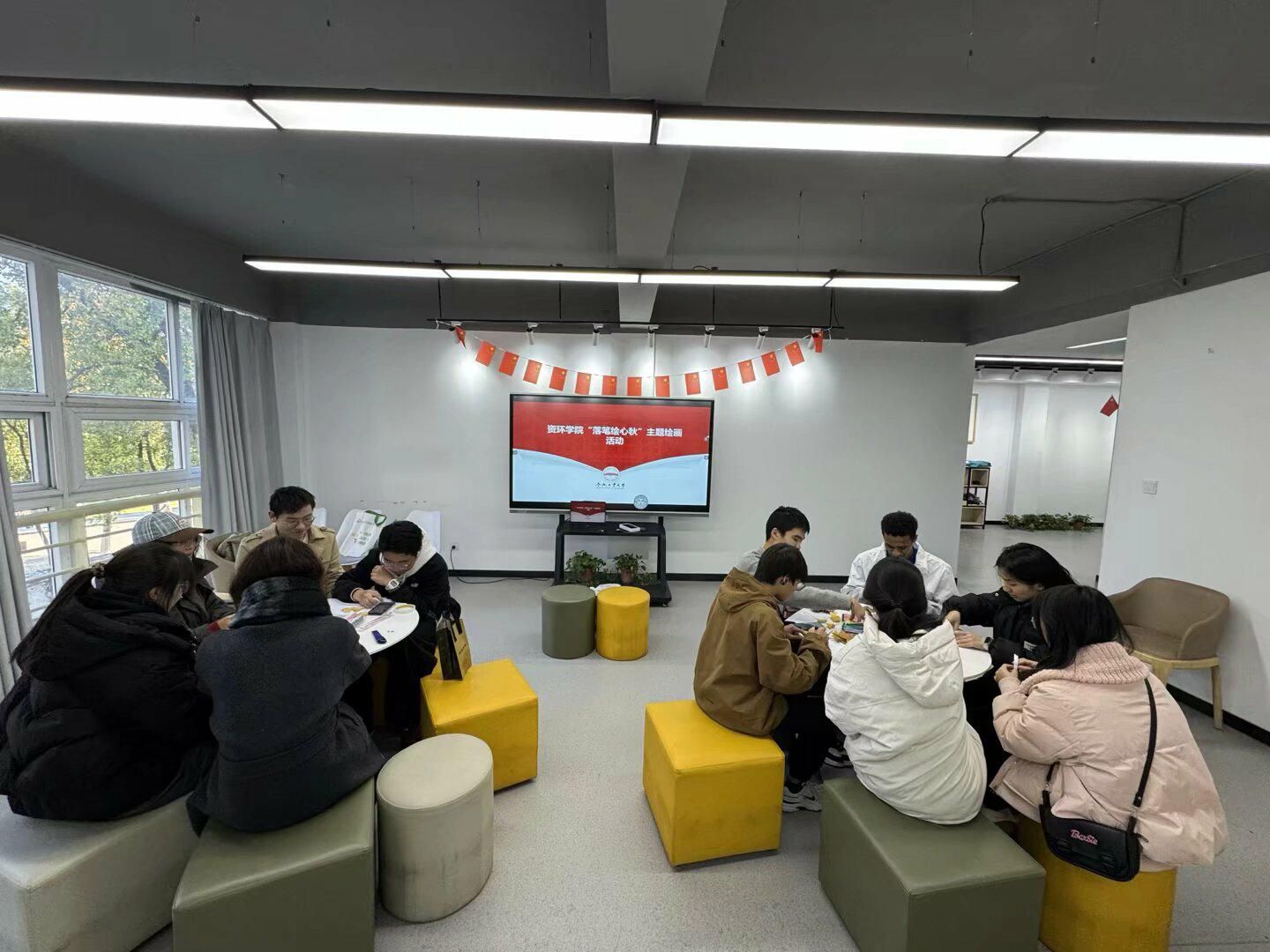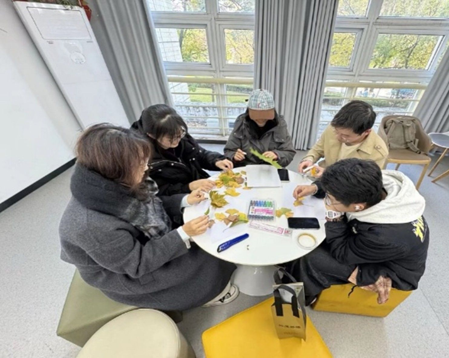 活动现场,形态各异、色彩缤纷的落叶迅速点燃了同学们的创作热情。在讲解制作技巧后,大家很快沉浸于艺术创作之中:有的巧手拼贴,勾勒出灵动的飞鸟与斑斓秋景;有的点缀绘制,展现内心的诗意画卷。现场气氛宁静而专注,大家在指尖与自然的对话中舒缓情绪,在交流协作中传递温暖。
