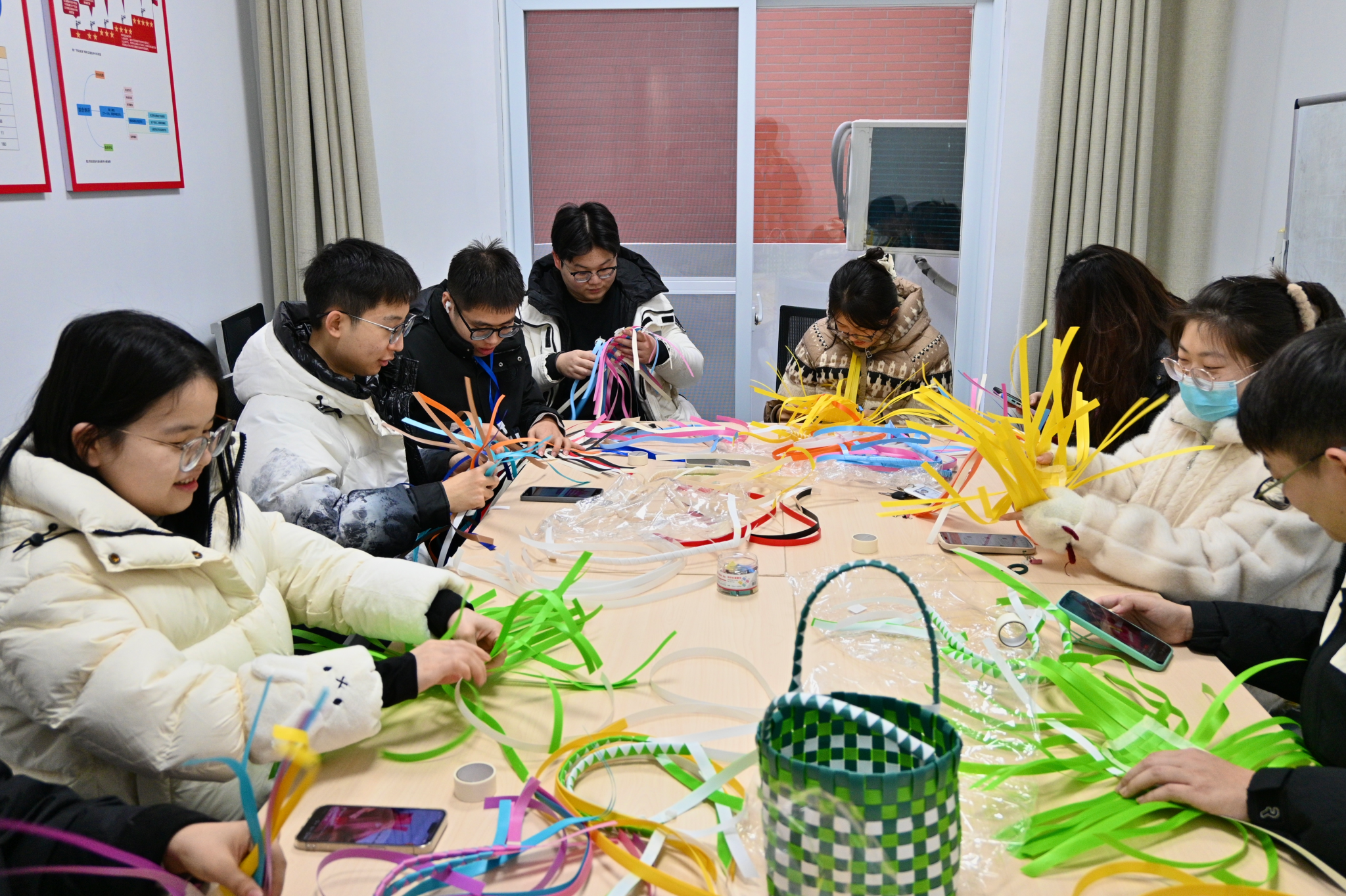 活动开始,徐晨晨分享了手工活动所蕴含的专注当下、梳理思绪的疗愈理念。随后在老师的引导下,同学们将指尖浸润于藤条的柔韧质感之中,从固定基底到经纬穿梭,全情投入到一挑一压的规律节奏里。现场氛围沉静而专注,散落的材料在同学们手中逐渐成型为独具巧思的编织篮,每一件作品都交织着耐心与当下的心意。