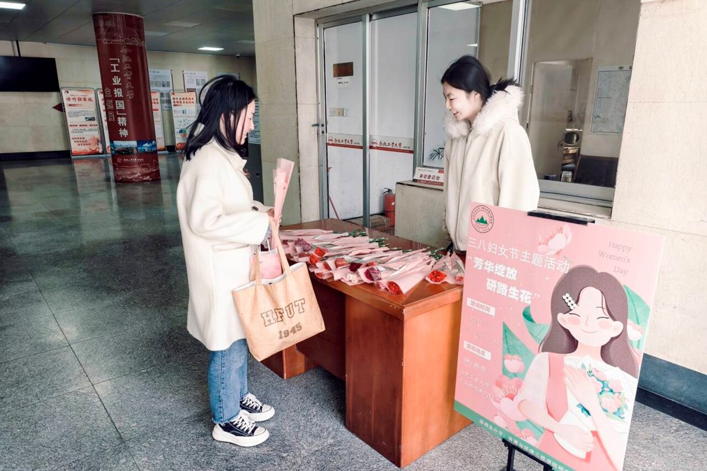 当天上午研究生会工作人员准时在屯溪路校区西教学楼门口拉开活动序幕。研会志愿者们早早准备了芬芳馥郁的鲜花,面带微笑,将一支支承载着美好祝愿的花束送到每一位到场的女老师和女同学手中。“节日快乐!”一声声真挚的祝福在晨光中传递,收到鲜花的老师们笑意盈盈,同学们惊喜连连,现场洋溢着温馨欢快的节日氛围。