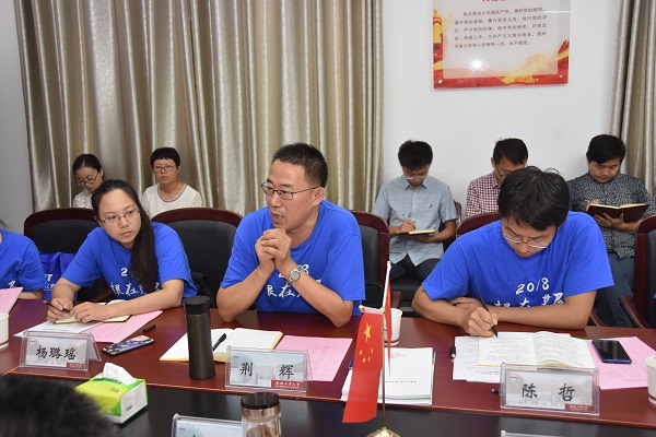 2018年9月19日下午,以中国大学生在线发展中心副主任荆辉同志为团长的“根在基层”教育部直属机关青年干部调研团一行8人,对我院资源科学与工程系教工党支部工作情况展开调研,并参加了资源科学与工程系教工党支部专题学习活动。专题学习活动在学院党员之家开展,资源系教工党支部17名党员参加了本次专题学习活动。校党委组织部副部长宋之帅参加了此次调研活动。