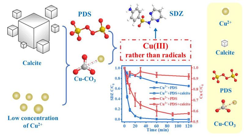 方解石是土壤环境中最常见的碳酸盐矿物,被认为是处理金属污染的有效稳定剂。Cu(II)活化氧化剂降解有机污染物能力有限,而固相铜(包括铜的氧化物和络合物等)能有效活化氧化剂处理有机污染物。综合两者优势,团队首次利用方解石将溶液中Cu(II)转化成固相铜活化过硫酸盐,实现抗生素有机污染物的高效处理。成果于2022年7月以题为“The synergistic effect of calcite and Cu2+ on the degradation of sulfadiazine via PDS activation: A role of Cu(Ⅲ)”发表在《Water Research》期刊上(图2)。taptap点点博士研究生孙付炜为论文第一作者,刘海波副教授为论文通讯作者,taptap点点官方网站为论文第一单位。