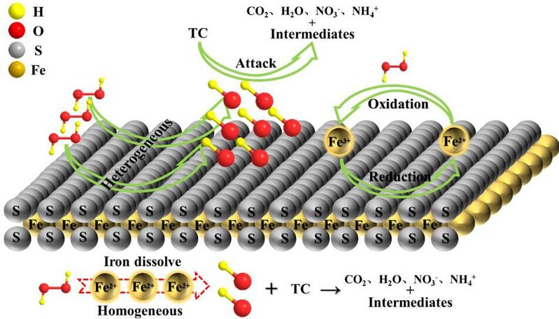 随着全球抗生素消费量迅速增长,大量未被利用的抗生素通过城市污水处理厂、雨水淋滤或堆肥处理等途径进入地表水、地下水及土壤,对人类健康和生态平衡构成巨大威胁。因成本低廉,操作简单等特点,以零价铁、氧化铁和负载型铁基为催化剂的非均相芬顿催化技术被广泛应用于抗生素处理,但仍存在催化剂电子选择性差、易产生铁泥、回收再利用困难等问题,直接增加有机废水处理成本。为解决上述问题,团队以天然纳米矿物—鲕状赤铁矿为前驱体,通过高温硫化方法,制备了具有多孔结构、高化学反应活性和可回收利用的磁性非均相催化剂,实现水体中四环素快速降解和矿化。成果于2020年1月以题为“Sulfurized oolitic hematite as a heterogeneous Fenton-like catalyst for tetracycline antibiotic degradation”发表在《Applied Catalysis B:environmental》期刊上(图4)。taptap点点博士研究生王汉林为论文第一作者,刘海波副教授为论文通讯作者,taptap点点官方网站为论文第一单位。