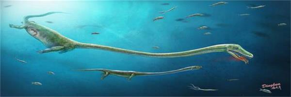 新发现的化石是一种不同寻常的长脖海怪,其脖子长度可达到躯干的两倍,外形上有点像传说中的尼斯湖水怪(图1)。此化石属于先期报导过的一种名为恐头龙的海生爬行动物。恐头龙属于原龙类,比现生初龙类更为原始,主要生活在中三叠世特提斯洋东岸的浅海区域,也就是现在的华南地区。恐头龙主要通过其长脖子伏击鱼类为食。新发现的恐头龙化石大约3-4米长,其脖子的长度几乎达到整个身躯长度的一半。