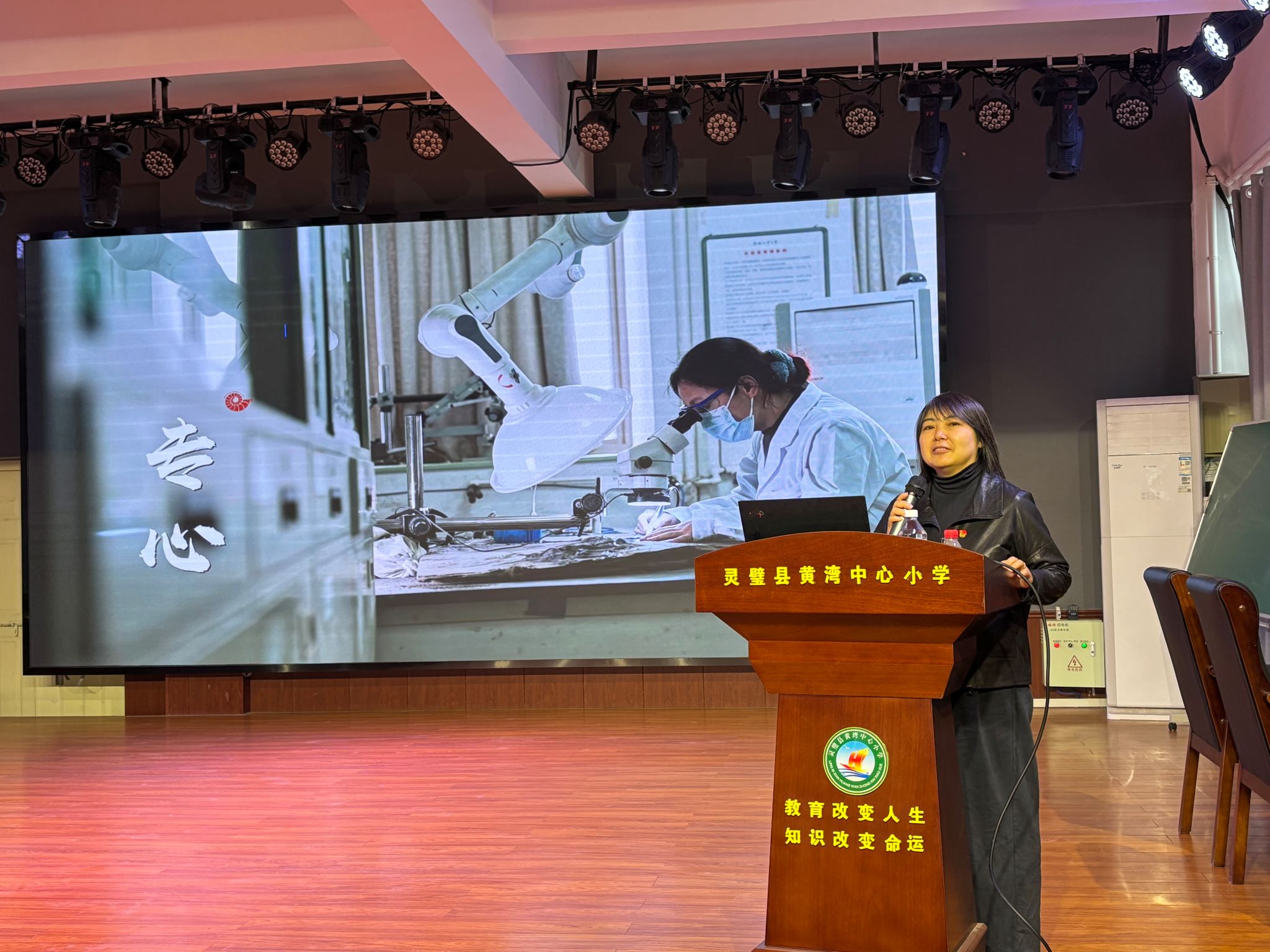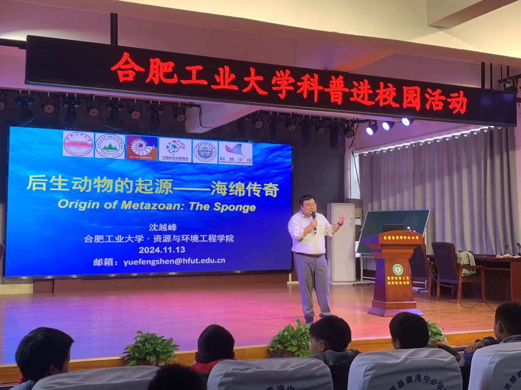 在灵璧县黄湾镇中心学校,资源科学与工程系教工党支部宣传委员沈越峰老师为四、五年级100余名小学生带去了一场别开生面的科普讲座。沈越峰以“后生动物的起源——海绵传奇”为题,向在场的小学生们介绍和解答了“谁是我们最古老的祖先?为什么说海绵是最古老的祖先?海绵动物到底有多老?海绵动物有哪些奇妙趣闻”等科普内容。讲座期间,主讲老师还和小学生们展开了生动有趣、紧张激烈的互动。
