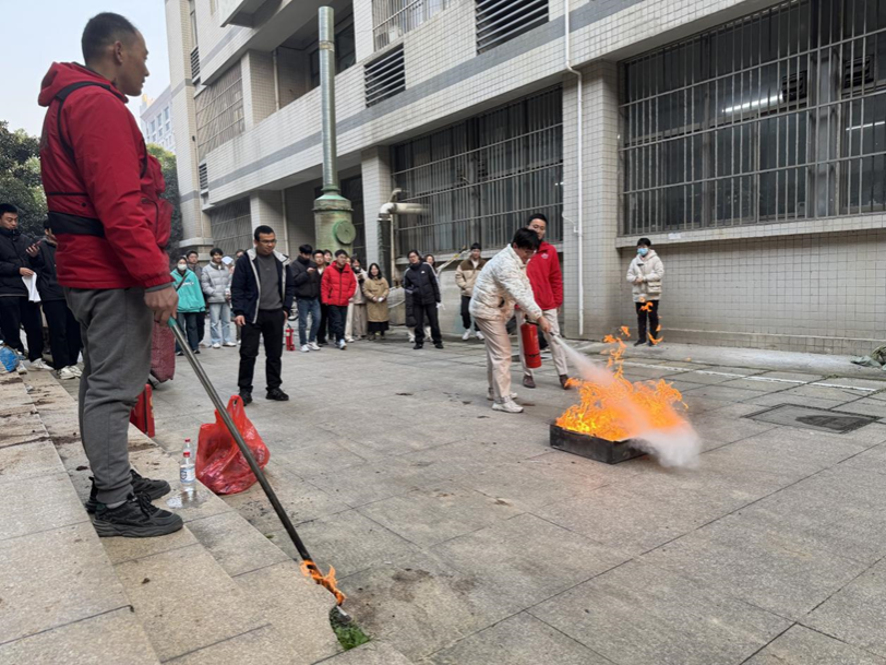 活动伊始,在纬地楼三楼会议室,由双安公司韦勇作消防知识宣讲与消防器材使用演示。随后,师生来到二楼大厅模拟室进行逃生疏散演习,最后在纬地楼主附楼之间空地进行灭火实操。通过演练活动,进一步提高了师生对突发风险源的警惕性,增强了应急意识,从而主动学习和掌握应急知识,并能验证应急预案的可操作性,提升应对突发情况的能力。