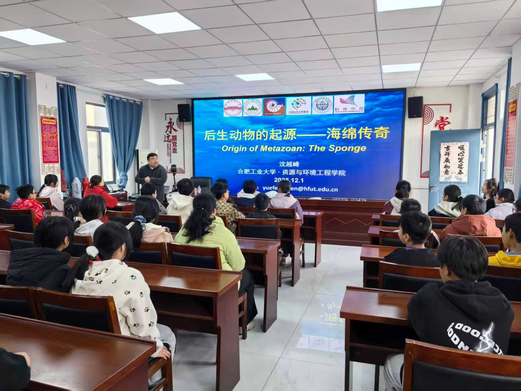 活动现场,资源科学与工程系沈越峰老师为马头镇中心学校全体学生带来了一场别开生面的地质科普讲座。讲座以“海绵宝宝”为切入点,将抽象难懂的地质知识转化为生动易懂的科普讲解,通过趣味互动、实景讲解等形式,引导少年儿童探索地质奥秘、感受科学魅力,点燃科学探索热情,实现用知识赋能乡村学子成长、为乡村教育发展注入新活力的目标。